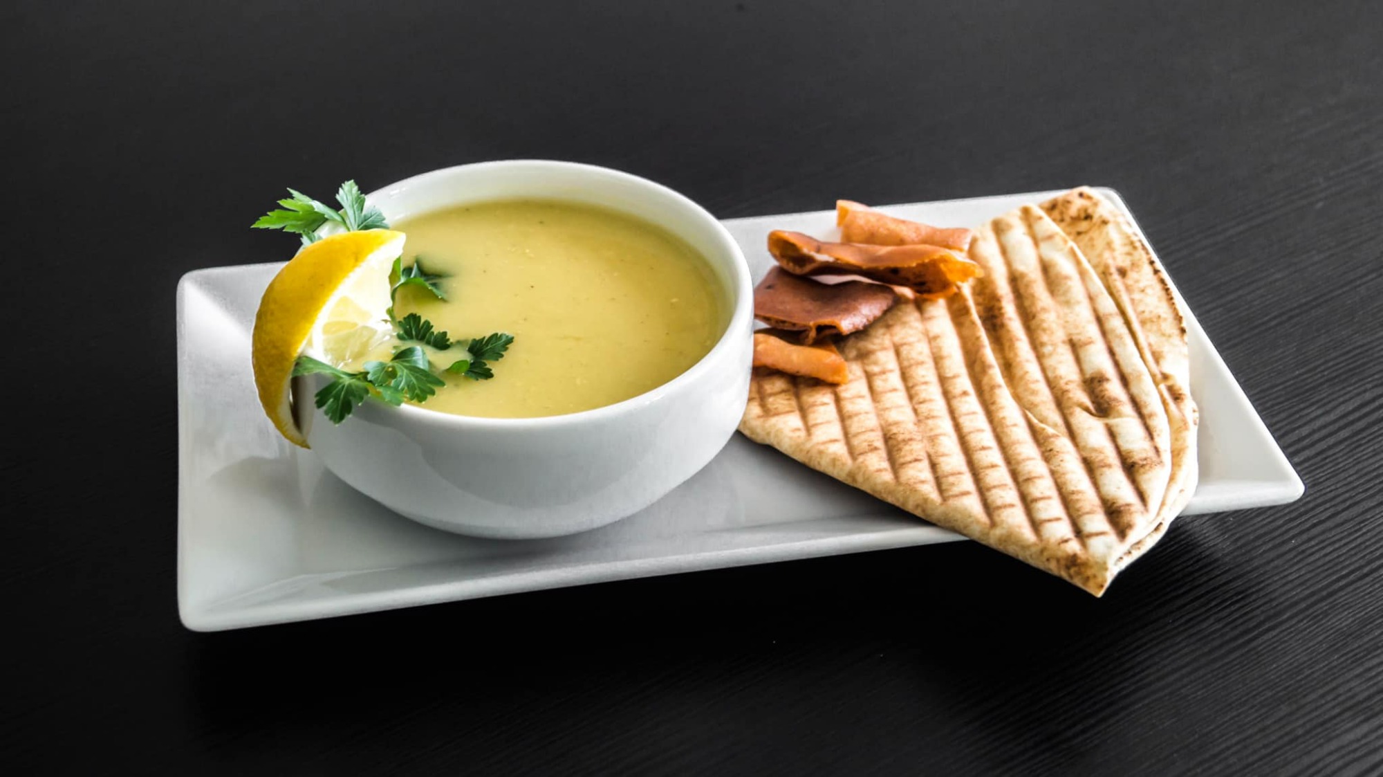 Pasta z ciecierzycy i tahini ( pasta sezamowa) oraz oliwy z oliwek podawana z grillowanym chlebkiem lawasz -